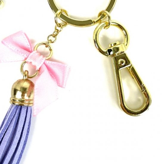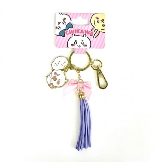 パープルのオシャレなタッセルが付いた、ちいかわのキーホルダーです。リングには、ちいかわの可愛いチャームが見えますね♡さらに、タッセルにはピンクのサテンリボンも施されていて、ガーリーテイストです。