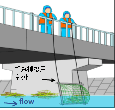 従来の川ごみ輸送量の測定方法は、人的な直接的サンプリング(下図)ですが、安全面や作業負担、コスト面、また川ごみは出水時に多く流出するため、急な対応が難しい等の課題がありました。