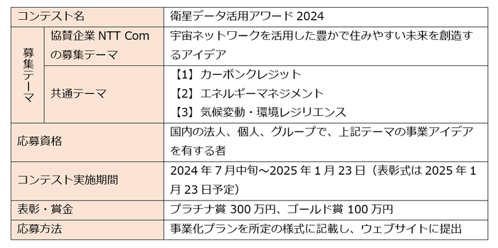 本プログラムは、グリーン分野で衛星データを活用する事業アイデアを募集します。また、優れたアイデアを有する個人・企業などを表彰し賞金を授与することで、事業化を支援します。