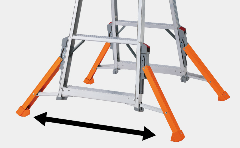 脚部が“ハの字”に外側へ広がる設計で、脚そのものがアウトリガーとして機能。脚が広がるので脚立を支える4点の幅も広がり、しっかりと安定した設置が可能になります。