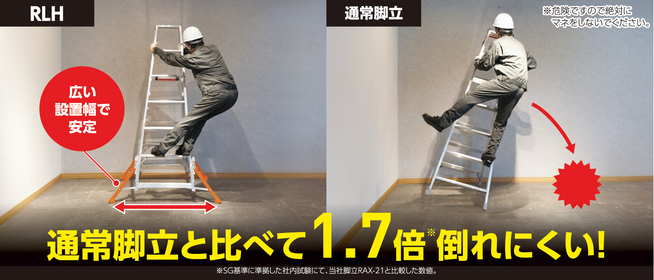 本製品は、従来オプション品であった横倒れを防ぐ補助器具「アウトリガー」を標準装備。脚部が外側に広がることで接地幅が拡大し、通常脚立と比べて1.7倍※倒れにくくなりました。ワンタッチ操作で簡単に開閉でき、設置もスムーズなため、現場ですぐに導入可能です。※SGの安定性基準に準拠した社内転倒試験において、当社脚立RAX-21と比較した数値。数値はあくまで測定値であり、使用環境や設置条件により異なります。