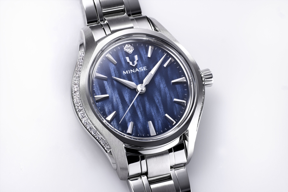 ダイヤモンドを4つの爪で留める爪留めをイメージしたクランピングケース構造を採用。文字盤は皆瀬川をゆっくりと流れる水流を表現している。