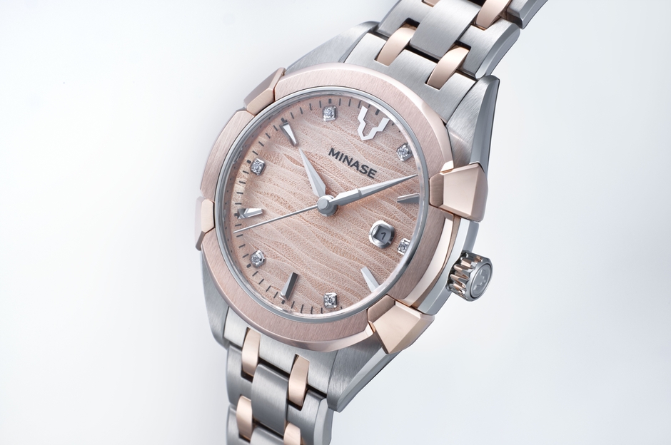 デザイナーはオリジナルMINASEと同じ山本 博邦氏。今回のエレガンスモデルは、普遍の美(世界共通の美しいもの)と日本の美意識(日本の美しいもの)をデザインに踏襲。これまでのMINASEは、立体的なデザインとエッジの効いた直線的なデザインが中心だったが、今回は曲線美と直線美を織り交ぜ、時計本体を一粒のプレシャスストーンと見立てた。両モデル共に宝石の石留めに用いる方法をケースの構造に採用、プレシャスストーン(時計本体)を大事に留める様をケースのデザインに表現した。このMINASEの新構造は「クランピングケース構造」といい、ベゼルとケースの間にガラスを挟み込み、下から締め付けて防水機能を実現させている。また、文字盤のベースは、両モデルとも協和精工・皆瀬工場近くを流れる「皆瀬川」の水面の表情をイメージし、インデックスは斜めにカットして、光の拾い方を複雑にしている。