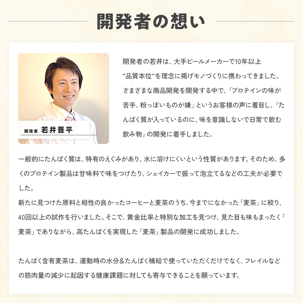 プロテイン開発の専門家と共同開発した独自の配合・製造技術により、たんぱく質特有の風味を抑え、麦茶本来の香ばしい味わいを実現。「我慢して飲む」ものではなく、「美味しいから毎日飲みたくなる」味わいを追求しました。