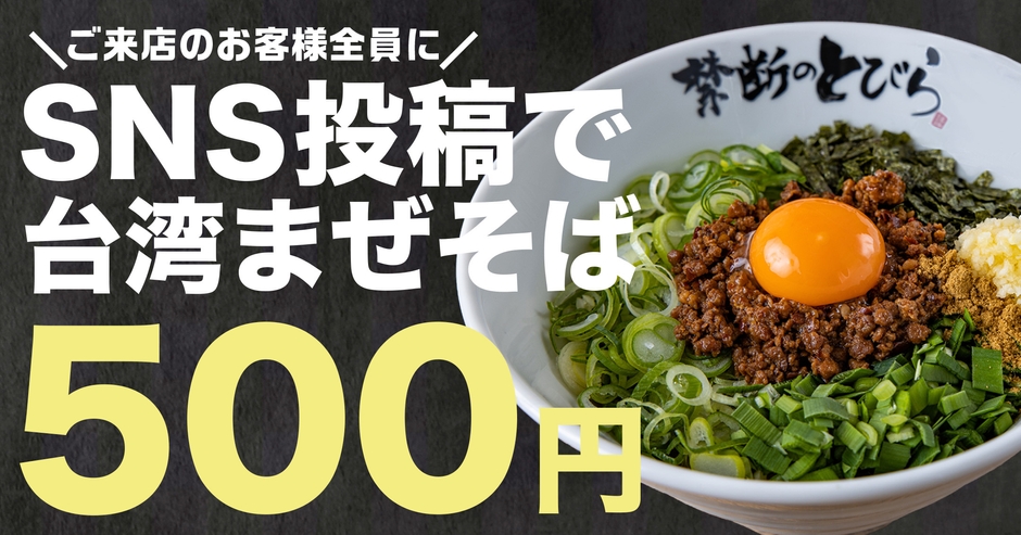 「禁断のとびら」エルエルタウン岡崎店のオープンを記念して、1月11日(火)限定、SNS投稿で台湾まぜそばを一杯500円でご提供いたします。