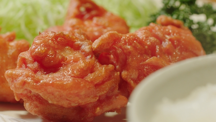 2.衣だけでなく、肉にも紅生姜の風味を染み込ませ、味の一体感を出しました。