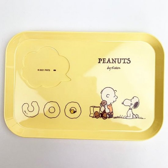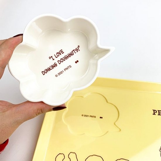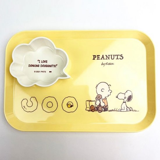 明るいイエローカラーの、メラミンプレートです。ドーナツを食べるチャーリーブラウンを、羨ましそうに見つめるスヌーピーのデザインが超キュート♡メラミン素材なので割れる心配もなく、お手入れも簡単です。