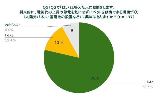 将来的に、電気代の上昇や停電を気にせずにペットを飼育できる環境づくり(太陽光パネル・蓄電池の設置など)に興味はありますか?(n=187)