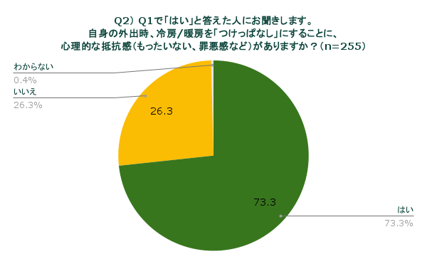 Q1で「冷暖房をつけっぱなしにする」と回答した人を対象に、自身の外出時に冷暖房をつけたままにすることに対し、「もったいない」「罪悪感がある」などの心理的な抵抗感を感じるかを質問したところ、「はい」と答えた人は約7割に上りました。