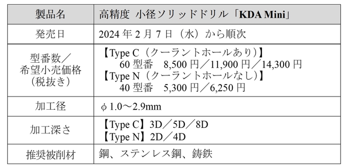 「KDA Mini」は、独自のトリプル&ダブルマージン構造※1と、新コーティング「MEGACOAT(R) NANO EX」(メガコート ナノ イーエックス)を採用したφ1.0~2.9mmの穴あけ加工用ソリッドドリルで、以下の特長があります。