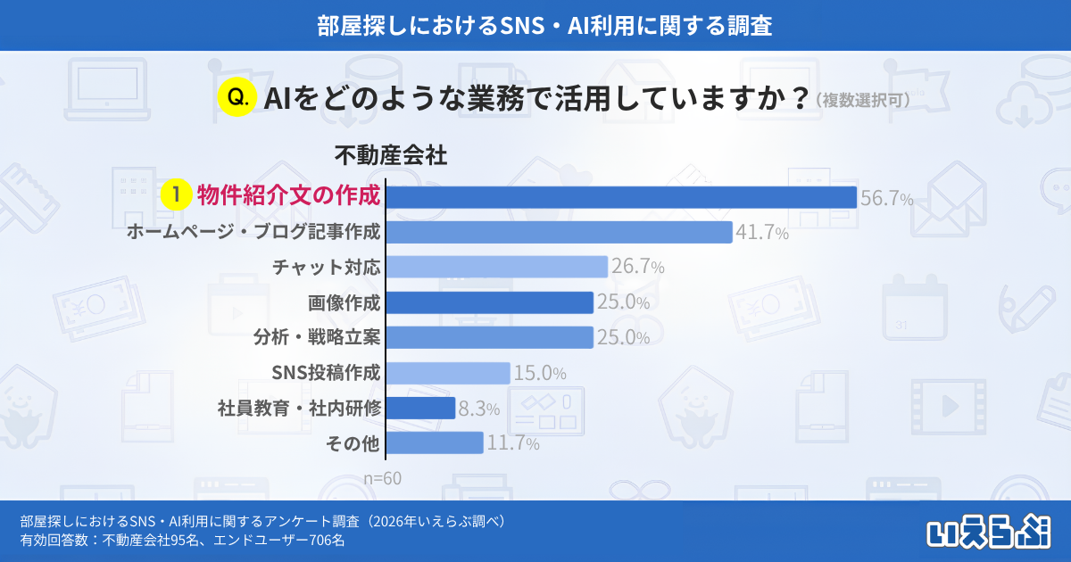 これらの結果から、エンドユーザーの部屋探しにおけるAI利用はまだ限定的である一方、不動産会社では業務での活用が広がっていることがわかります。