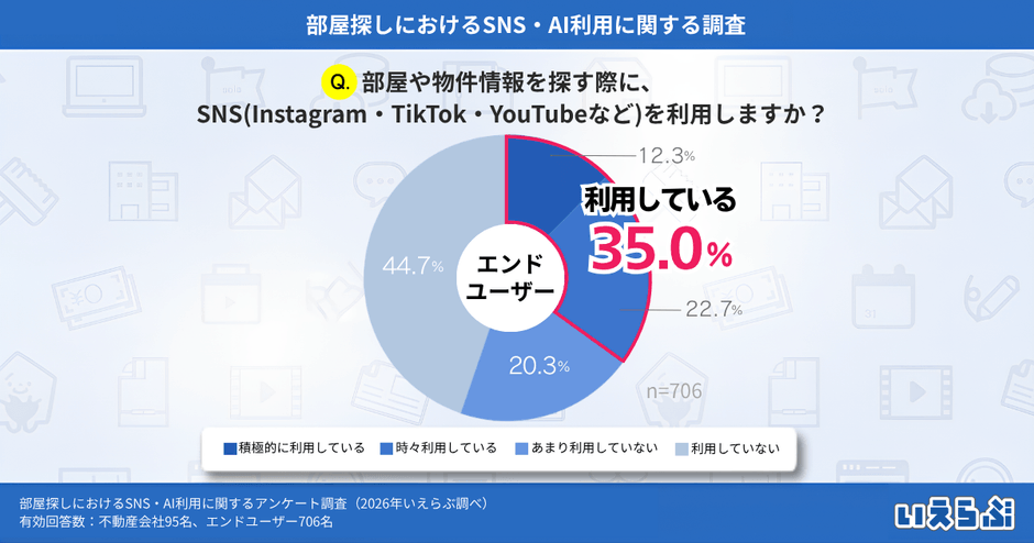 エンドユーザーに「部屋や物件情報を探す際に、SNS(Instagram・TikTok・YouTubeなど)を利用しますか?」という質問をしたところ、「積極的に利用している」(12.3%)、「時々利用している」(22.7%)、「あまり利用していない」(20.3%)、「利用していない」(44.7%)という結果となりました。
