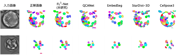 本研究ではまず、マウス胚が成長していく過程を撮像した時系列3次元明視野顕微鏡画像データを用いて、細胞核の特徴を定量するためのセグメンテーションアルゴリズムFL2-Netを構築しました。FL2-Netは、細胞が密集している領域でも正確に細胞核を識別するための機構を備えているほか、時系列画像における連続フレームを参照することで時間的な変化も考慮した予測を行うという特徴があります。その結果、FL2-Netは、既存のAI手法(QCANet, StarDist, EmbedSeg, Cellpose3)をすべて上回る精度を実現しました。(図2)