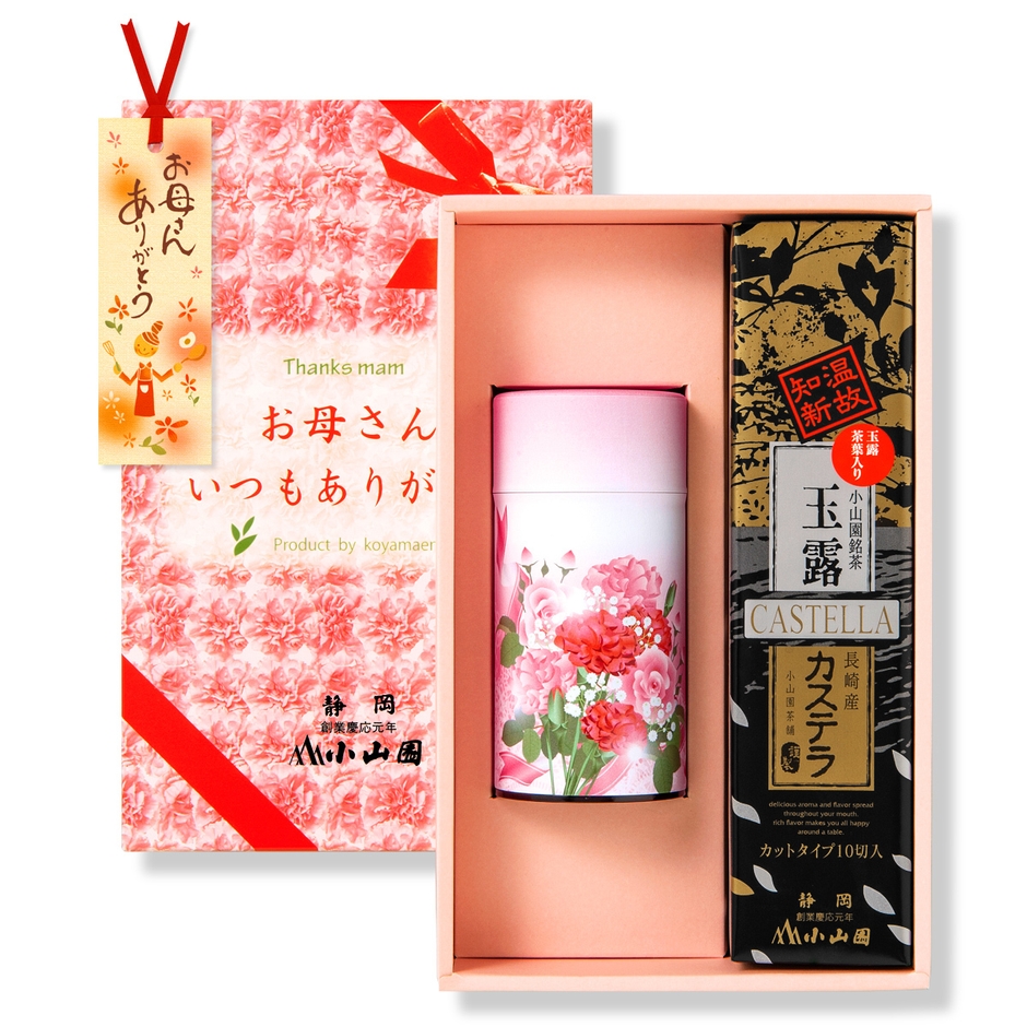 株式会社小山園茶舗(静岡県静岡市、代表取締役社長:成岡 謹蔵)は、『母の日新茶&玉露カステラ 詰合せ 3,888円(税込)』の予約販売を4月3日(月)に開始しました。母の日に新茶を送る文化を広め、お世話になった方に感謝の気持ちを届けるお手伝いがしたいと願い生まれたこの商品。カーネーション柄の茶缶の新茶と、玉露カステラの組み合わせが好評で、日ごろお世話になっている方への感謝をこめて新茶を送る方が増えています。