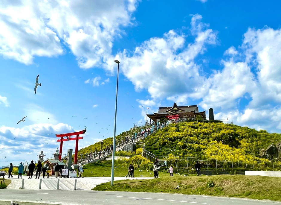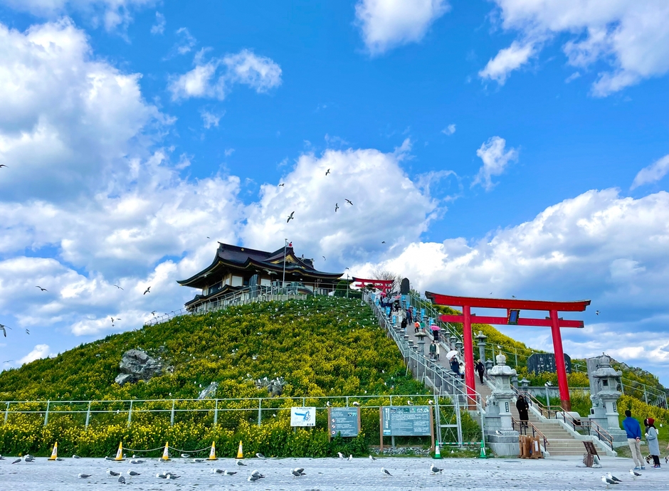 蕪島の頂上まで伸びる長い階段を上ると、「蕪嶋神社」が姿を現します。2015年に火災による消失という悲劇に見舞われましたが、多くの人々からの支援により2019年に復活を遂げました。蕪嶋神社のある蕪島の斜面はウミネコの繁殖地となっており、6月頃になると、愛らしいひな鳥の姿を間近に見ることができる国内でも珍しい場所です。