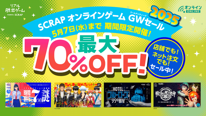 全世界で累計1,490万人以上を動員しているリアル脱出ゲームを企画制作する株式会社SCRAP(本社:東京都渋谷区、代表:加藤隆生)は、2025年4月23日(水)〜5月7日(水)の15日間限定で、自宅で遊べるオンラインゲームを対象とした「SCRAPオンラインゲーム GWセール2025」を開催いたします。