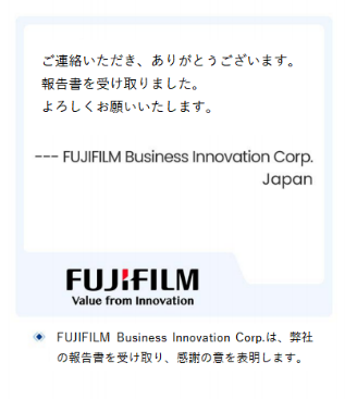 「ご連絡いただき、ありがとうございます。報告書を受け取りました。よろしくお願いいたします。」