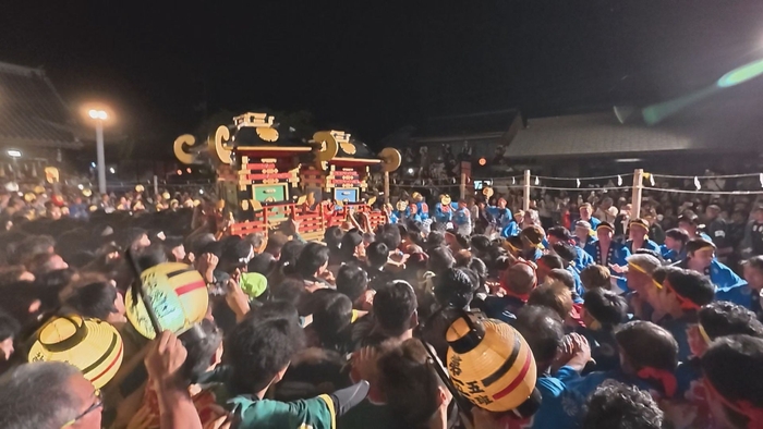 境内に響き渡る、重厚で荘厳な音。広島県福山市新市町の素盞嗚神社で神輿をぶつけ合う、けんか神輿が今年も始まりました。