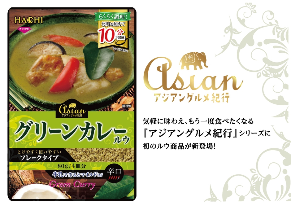ハチ食品株式会社(大阪府大阪市、代表取締役社長:高橋 慎一、以下 ハチ食品)は、アジアン料理が気軽に味わえるシリーズ『アジアングルメ紀行』の新商品として、「グリーンカレールウ」を2024年3月1日(金)に発売いたします。