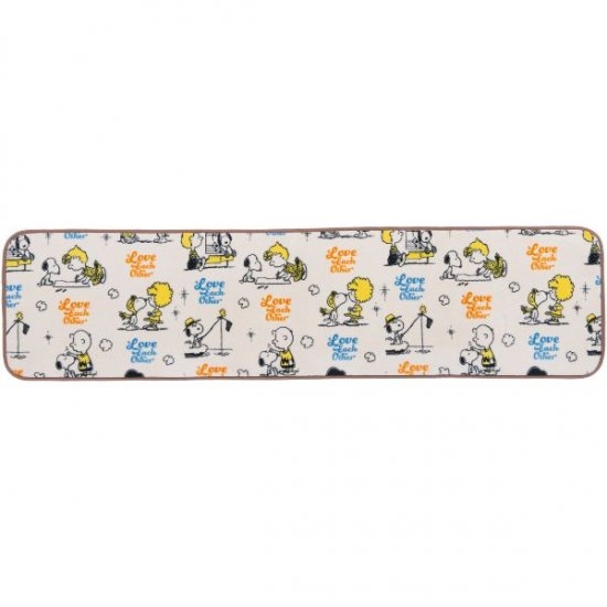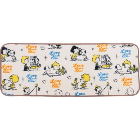 スヌーピーとフレンドたちがコミュニケーションをとっているイラストがキュートな、ラグマットです。