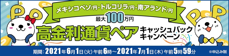 GMOインターネットグループのGMOフィナンシャルホールディングス株式会社の連結会社で、金融商品取引業を営む株式会社FXプライムbyGMO(代表取締役社長 安田和敏、以下FXプライムbyGMO)は、ご好評につき、最大1,000,000円の高金利通貨ペア(メキシコペソ/円、トルコリラ/円、南アフリカランド/円)のキャッシュバックキャンペーンを、6月も継続することを決定いたしました。