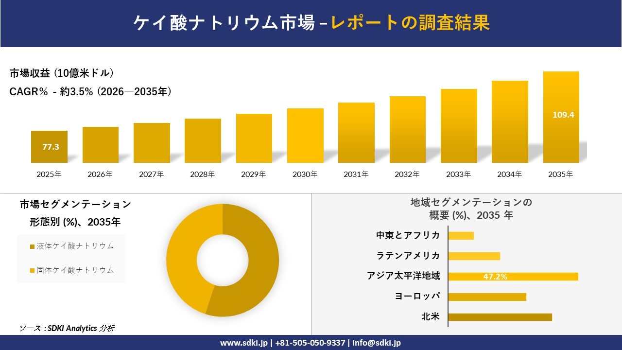 提出日 (2026年04月07)、SDKI Analytics(本社:渋谷区、東京都)は、2026年と2035年の予測期間を対象とした「ケイ酸ナトリウム市場」に関する調査を実施しました。