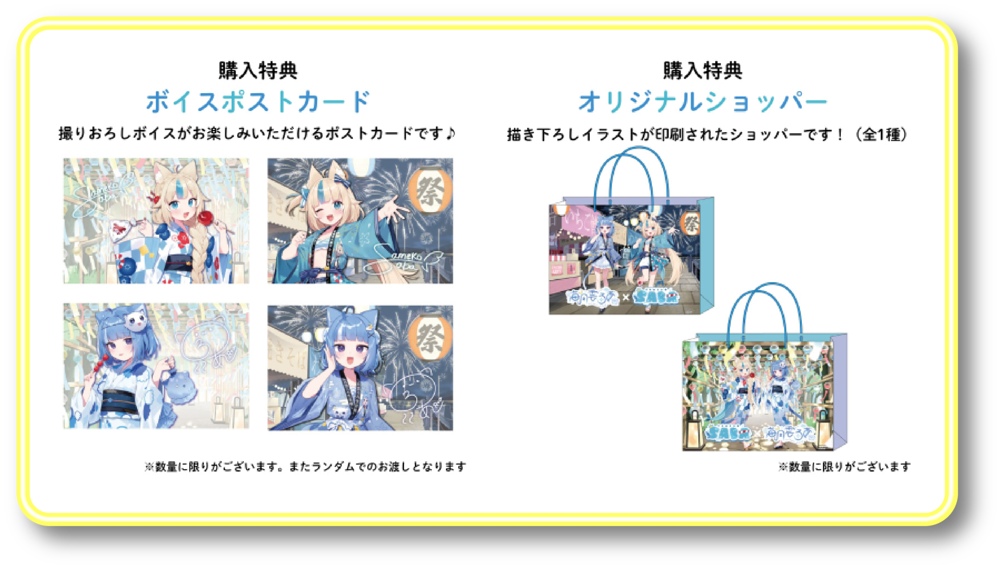 2025年にデビューしたVTuber、Sameko Sabaと海月雲ろあが、初めてコラボレーションします。本イベントでは、凍咲しいな先生・なもり先生のイラストを使ったオリジナルグッズの販売に加え、二人の等身大スタンディと祭りをテーマにした写真が撮れるフォトスポットや、『ひもくじ』『わなげ』を体験して景品を入手できる屋台(有料)など、見て・遊んで・集めて・楽しめる内容が盛りだくさん。ファン必見の特別な祭り空間をお楽しみください。