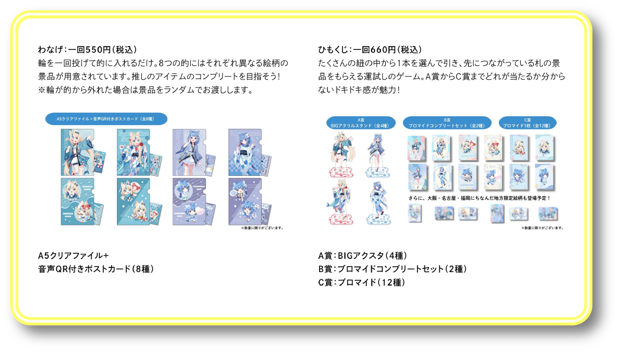 イベント限定グッズを多数ご用意しています。人気のアクリル系商品や祭りらしい法被、定番のトレーディング缶バッジなど、充実のラインナップでお客さまをお待ちしております。ご購入金額に応じて「ボイスポストカード」・「ショッパー」の特典をプレゼントするほか、通販限定で販売するぬいぐるみやプレミアム刺しゅう法被もあります。