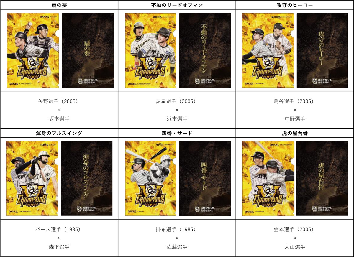 本グルメフェアでは、阪神タイガース監督・選手コラボグルメ、またはレジェンズコラボグルメをご購入いただいた方に、現役監督・選手と過去のリーグ優勝時のOB監督・選手がデザインされた「優勝記念クリアファイル(全10種)」をプレゼントします。