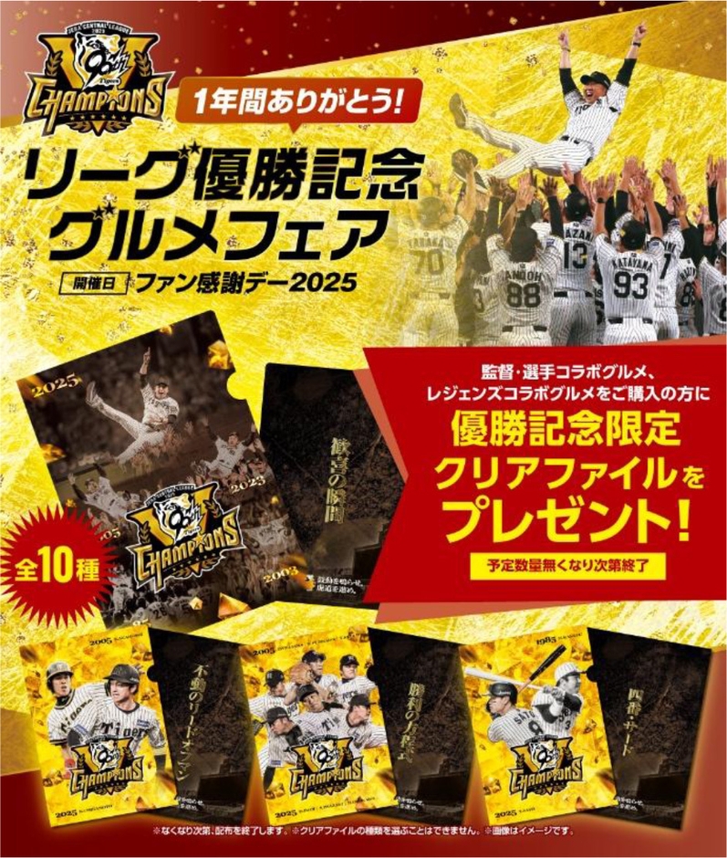 実施日程において、阪神甲子園球場内売店・ワゴンおよび外周お弁当ワゴンで「阪神タイガース 監督・選手コラボグルメ」「レジェンズコラボグルメ」を1商品ご購入ごとに、現役監督・選手とリーグ優勝時のOB監督・選手がデザインされた「優勝記念クリアファイル」(全10種)の中から、1枚をプレゼントします。