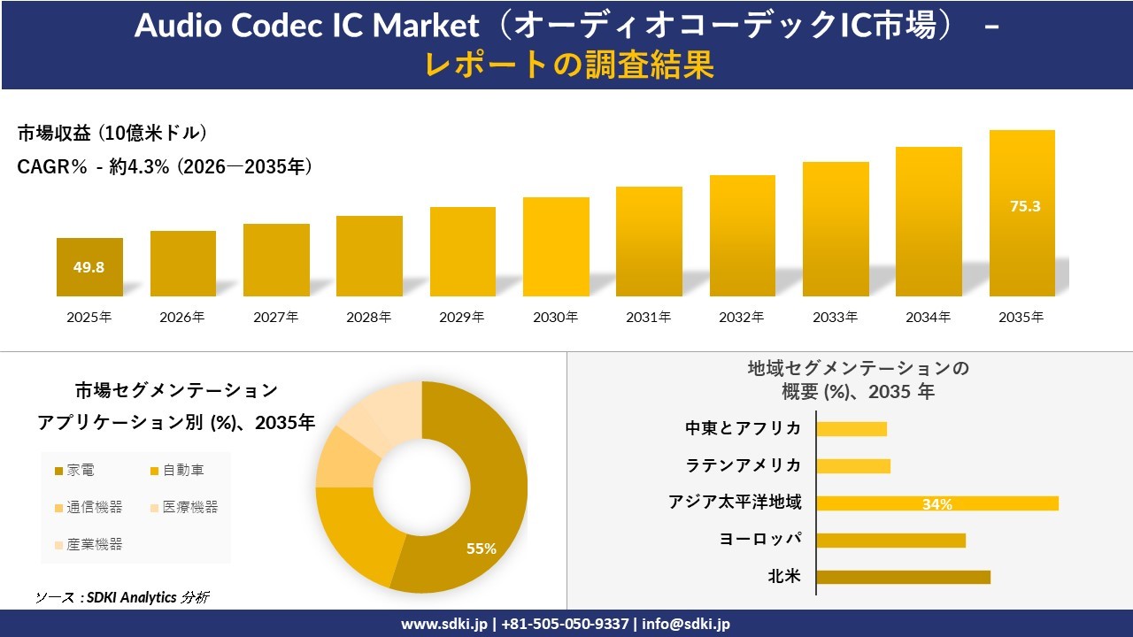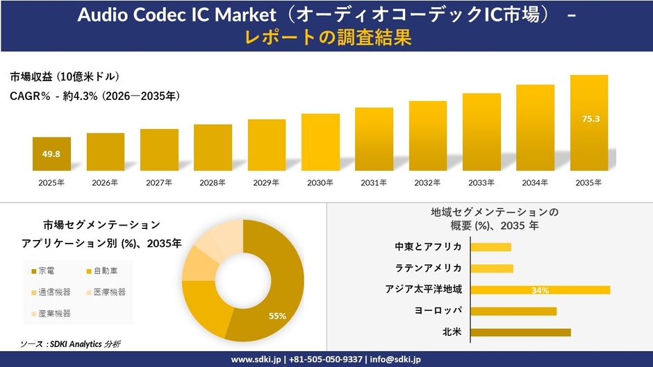 提出日 (2026年04月24)、SDKI Analytics(本社:渋谷区、東京都)は、2026年と2035年の予測期間を対象とした「Audio Codec IC Market(オーディオコーデックIC市場)」に関する調査を実施しました。