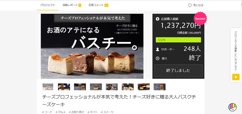プロジェクト初日で目標500%を達成し、その後も多くの方に応援いただき、最終的に計248名、目標達成率1237%を記録した、注目のバスクチーズケーキです。