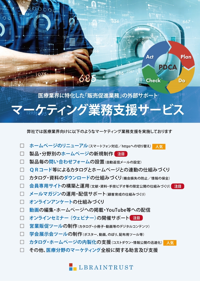 エルブレーントラスト株式会社(所在地:横浜市中区、代表取締役:森本尚樹)は、国内の中堅・中小の医療機器・医科器械メーカーおよび医療分野に参入を考える国内メーカーに対し、マーケティングや販売促進の業務を支援する新たなサービスを開始します。