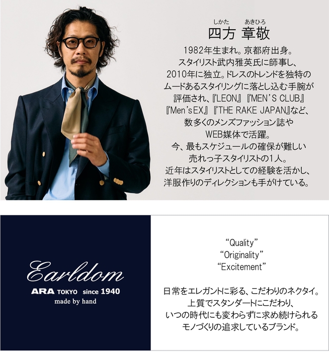 ちなみに、ファッションのカジュアル化が進んだ反動か、装いにドレス度をプラスするワンポイントとして、世界的にも薄手の巻き物はトレンドの気配。人気スタイリスト四方章敬氏と、アラ商事の旗艦ブランド「Earldom(アールダム)」の3弾目のコラボとして作成した今回の2タイプのネッカチーフは、そんなトレンドを先取りするのにも絶好のアイテムと自負しております。