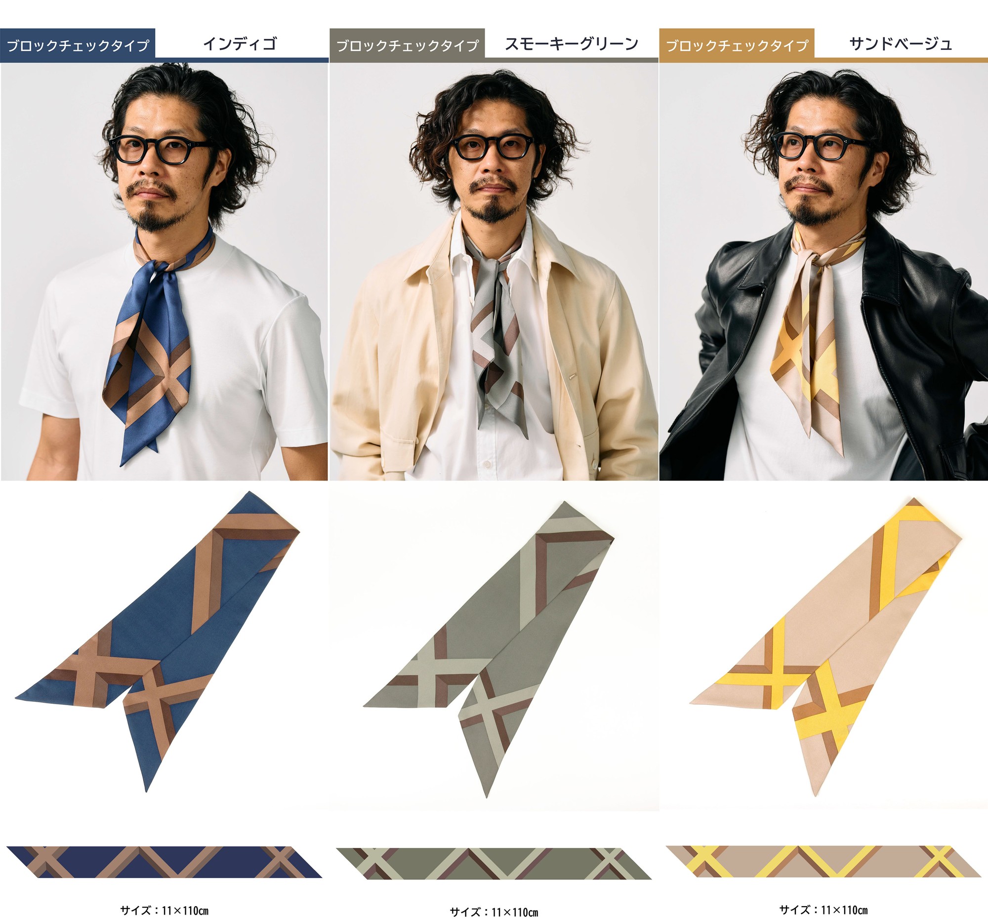 四方氏がプロデュースした今回のシルクネッカチーフは、「リバーシブル」と「ブロックチェック」の2型あります。どちらも初心者が気軽に取り入れられるよう、四方氏が色味や配色にとことんこだわりました。
