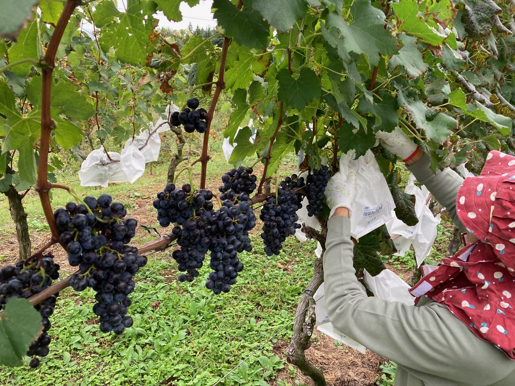 長野県・小諸市の浅間山麓の自家畑で育てた、ワイン用ぶどう・メルロー種を、ひと房ひと房を手摘みし、熟しきった“良いぶどうだけ”を丁寧に選別しました。