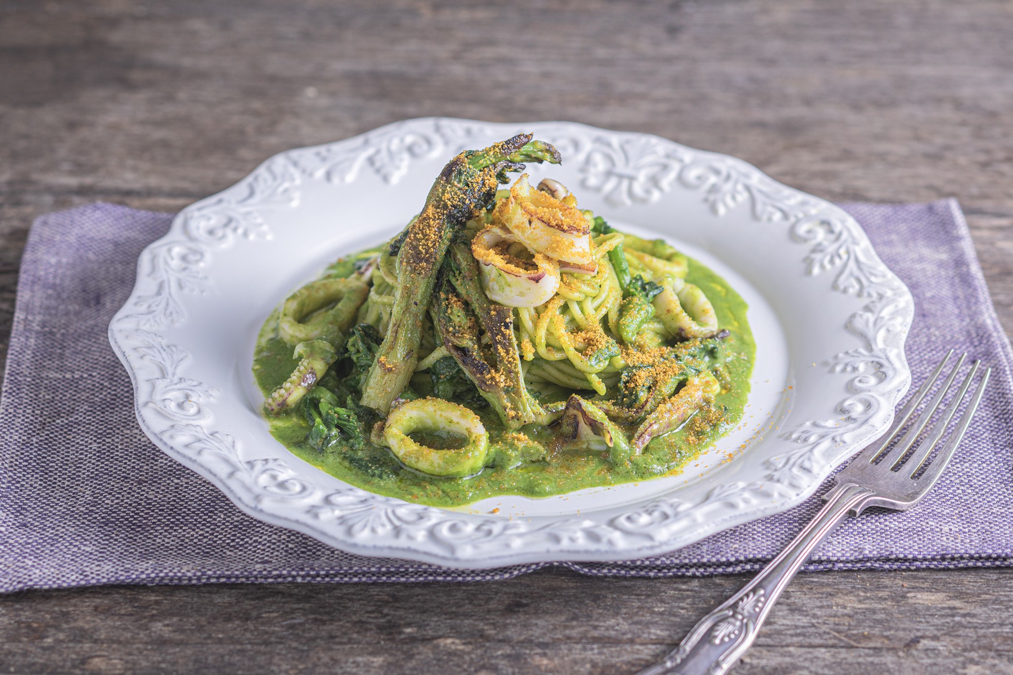 『福岡県産ヤリイカとカラスミ・菜の花のサルサヴェルデソースパスタ』