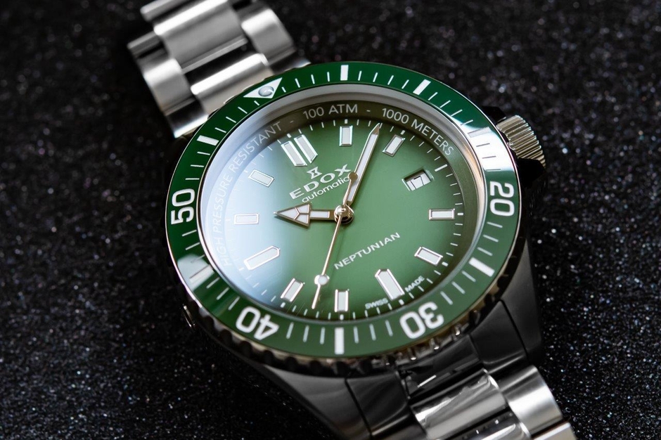 自動巻き、キャリバーEDOX80/約38時間パワーリザーブ/防水1000m/316Lステンレススティールケース/グリーンダイアル/ケース径44mm/ステンレススティールブレスレット
