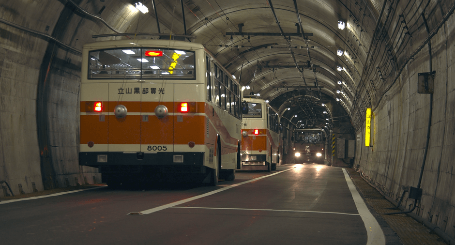 立山トンネルトロリーバスは立山黒部アルペンルート内の室堂~大観峰(約3.7km)を10分間で結ぶ、日本最後のトロリーバスです。立山の主峰・雄山(3003m)の直下を貫通する立山トンネルを走るトロリーバスとして1996年から運行を開始し、これまで約1920万人にご乗車いただきました。