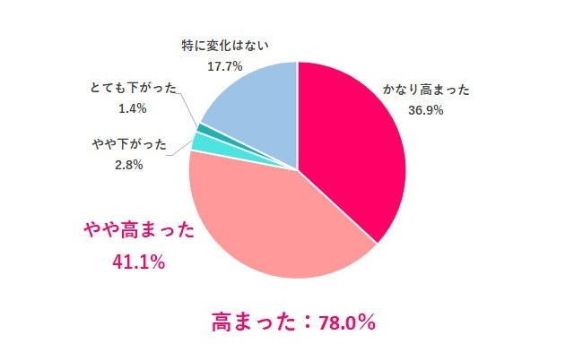カジュアル面談をして企業への応募意欲が高まったかという質問では、「かなり高まった」36.9%、「やや高まった」41.1%で、高まったと回答した人はあわせて78.0%でした。反対に「やや下がった」2.8%、「とても下がった」1.4%と、下がったと回答した人はあわせて4.2%と少数派でした。