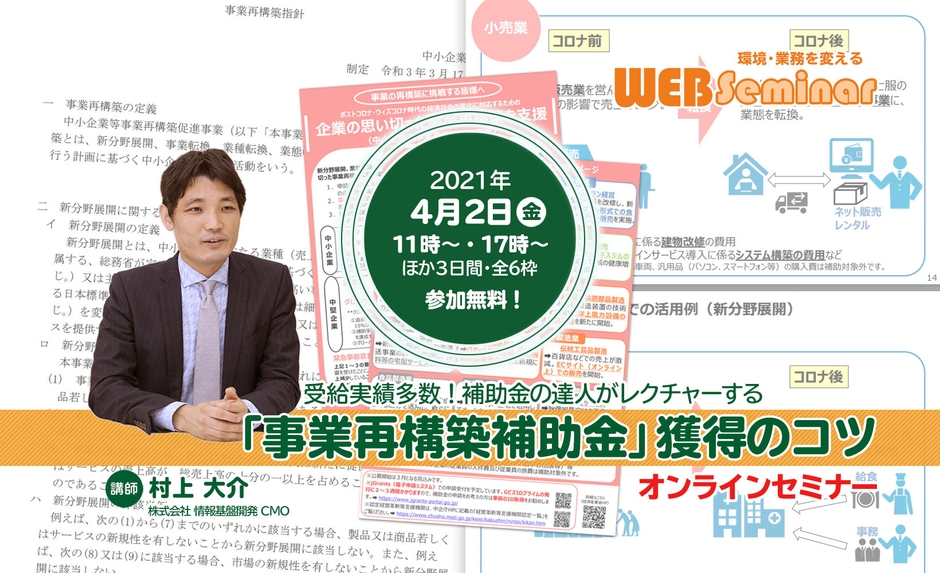 株式会社情報基盤開発(本社:東京都文京区湯島4丁目1番地11号 南山堂ビル、代表取締役:鎌田 長明)は2021年4月2日(金)・6日(火)・9日(金)の3日間、無料オンラインセミナー「事業再構築補助金 獲得のコツ」を開催いたします。