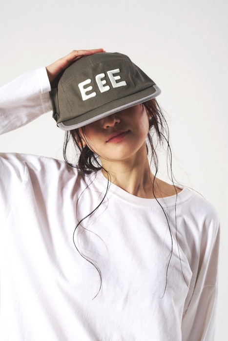 右サイドに配されたポケットは小物の収納に便利で、フロントには大胆な「EEE」レタリングを配置。