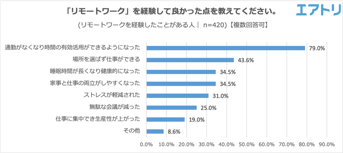 最も多かったのは、「通勤がなくなり時間の有効活用ができるようになった」(79.0%)、次いで「場所を選ばず仕事ができる」(43.6%)、「睡眠時間が⻑くなり健康的になった」(34.5%)、「家事と仕事の両立がしやすくなった」 (34.5%)、「ストレスが軽減された」(31.0%)と続く結果となりました。