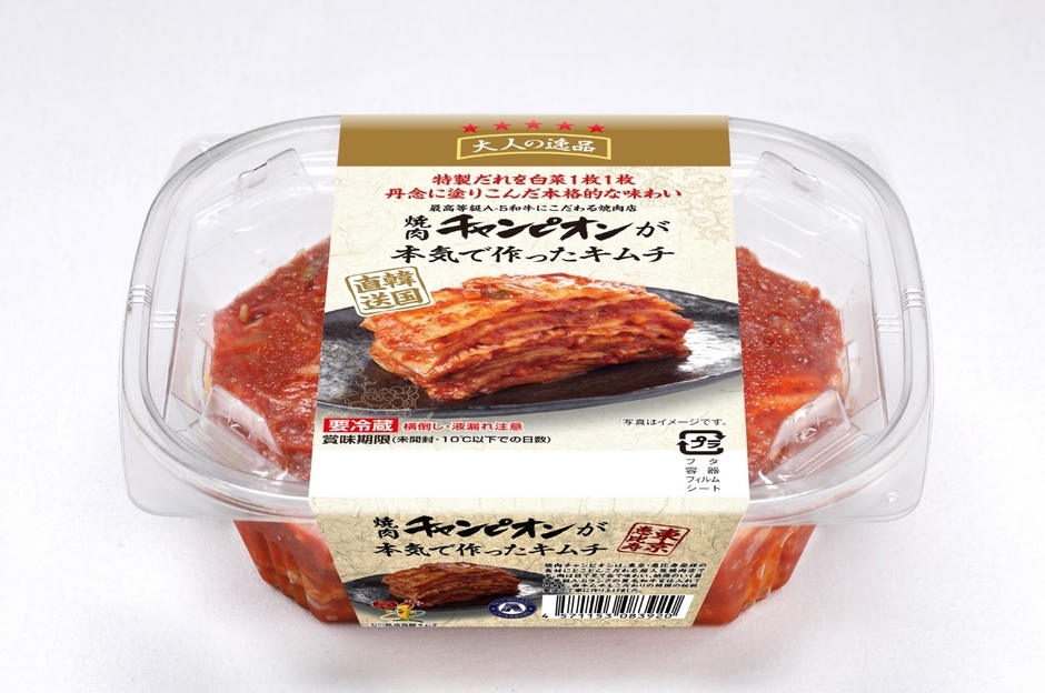 A5黒毛和牛にこだわった上質な焼肉を味わえる人気焼肉店『焼肉チャンピオン』監修のキムチです。白菜1枚1枚に丁寧にキムチのタレを挟み込むという、非常に手間のかかる伝統的な製法で作り上げたキムチとなります。甘みと辛さ、にんにくの風味の絶妙なバランスの取れた味わいとなり、人気焼肉店納得の一品です。2021年3月より、順次リニューアル出荷となります。
