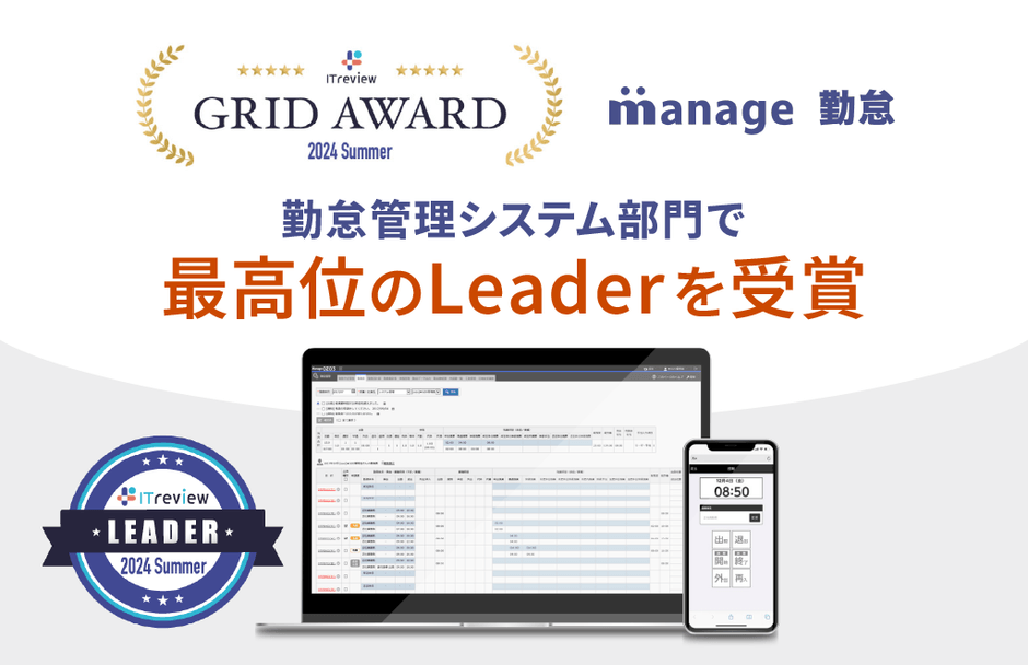 クラウド勤怠システム「manage 勤怠」が ITreview Grid Award 2024 Summerで最高位のLeaderを受賞