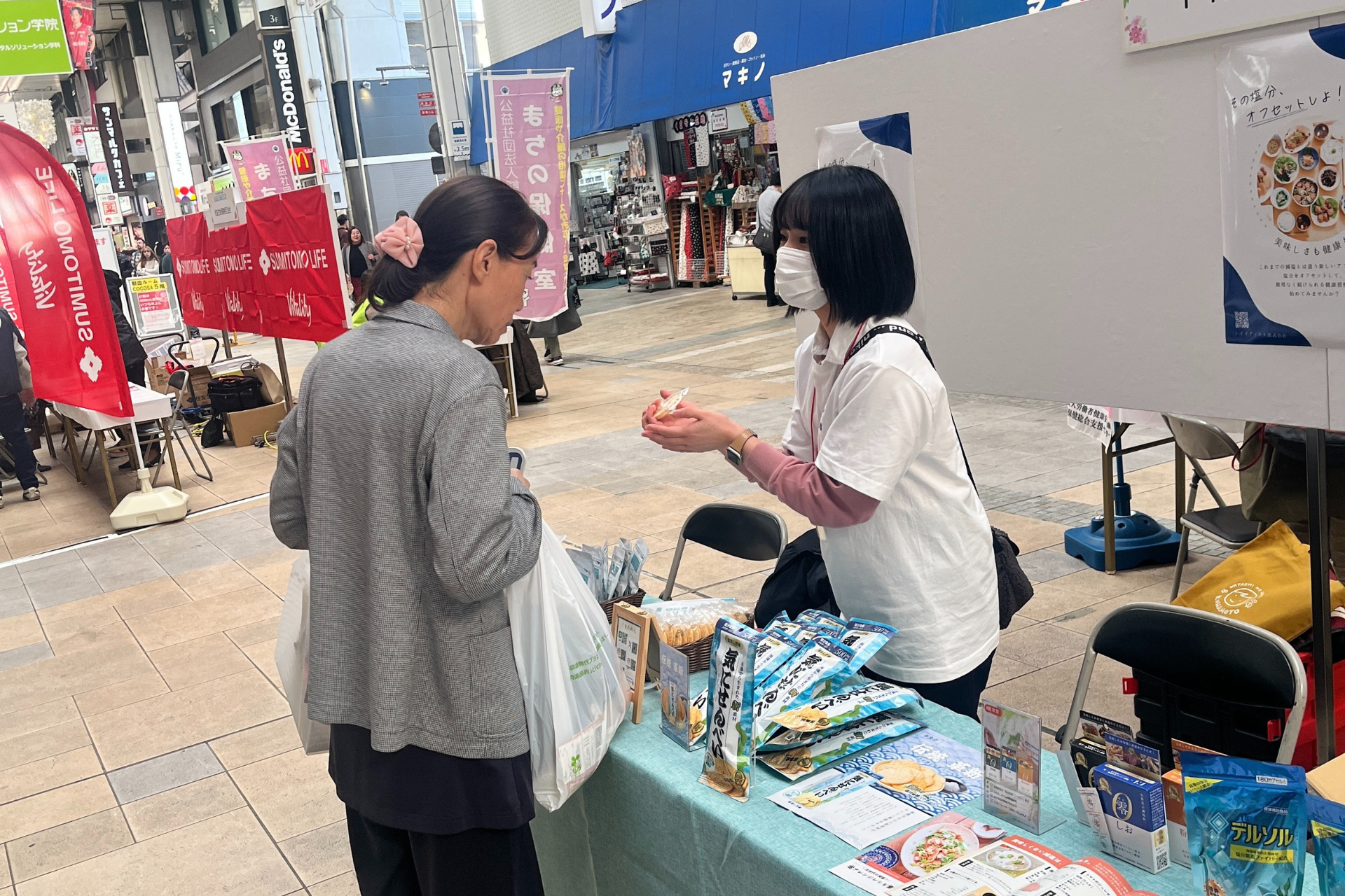 くまもと健康づくり県民フォーラム2025と同時開催された「くまもと健康づくり県民横丁」では、当社スタッフが来場者に直接商品の特長や使い方を説明し、塩分コントロールの新しい選択肢を紹介しました。会場では製品サンプルの配布も行い、従来の減塩商品とは異なる特徴をもつ「おいしさそのままの健康ケア」について理解を深めていただく機会を提供しました。