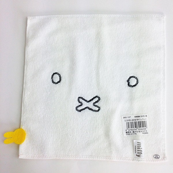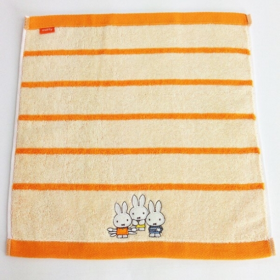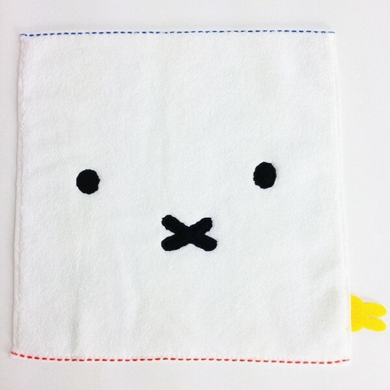 こちらもミニタオルです。ミッフィーのお顔デザインがとってもキュート。ブルーとオレンジのステッチもさりげなくていいですね。サイズは25×25cmです。清潔感のある白で、とっても人気のデザインですよ。