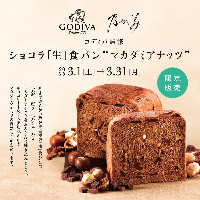 乃が美より『ゴディバ監修 ショコラ「生」食パン “マカダミアナッツ”』 3月1日(土)より全国で期間限定にて販売