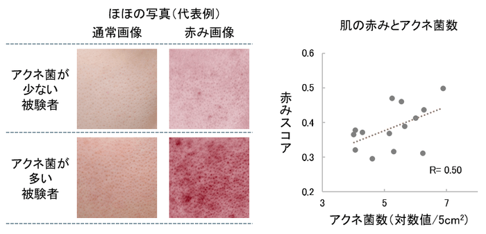 その結果、肌の赤みが強い人はアクネ菌の数も多くなる傾向がみられました(図1)。すなわち、アクネ菌の数が肌の赤みに関与していると考えられました。