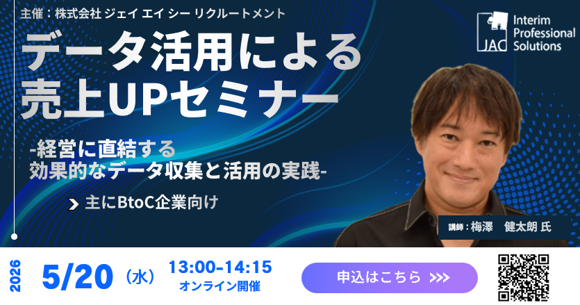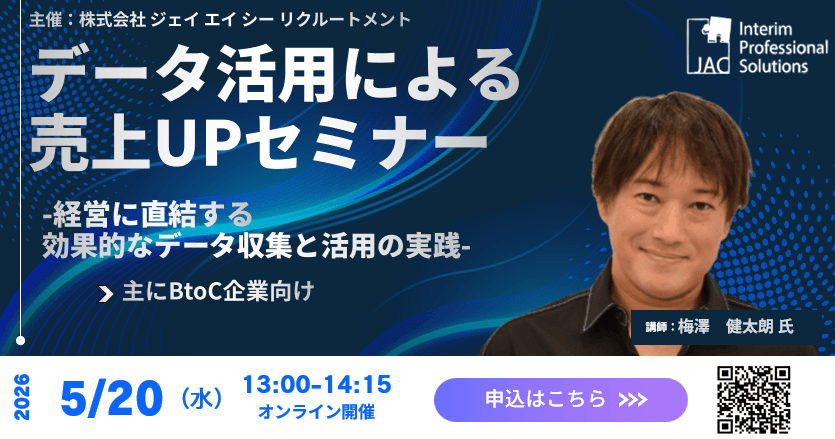 世界12ヵ国で人材紹介事業を展開する業界大手の株式会社ジェイ エイ シー リクルートメント(代表取締役会長兼社長:田崎ひろみ、以下JAC)は、2026年5月20日(水)13:00より、累計100社以上のECコンサルティングやECと店舗のシナジー最大化を得意とする梅澤健太朗氏を講師に迎え、JAC Interim Professional Solutions seminar『データ活用による売上UPセミナー -経営に直結する効果的なデータ収集と活用の実践- (主にBtoC企業向け)』を開催します。参加は無料です。